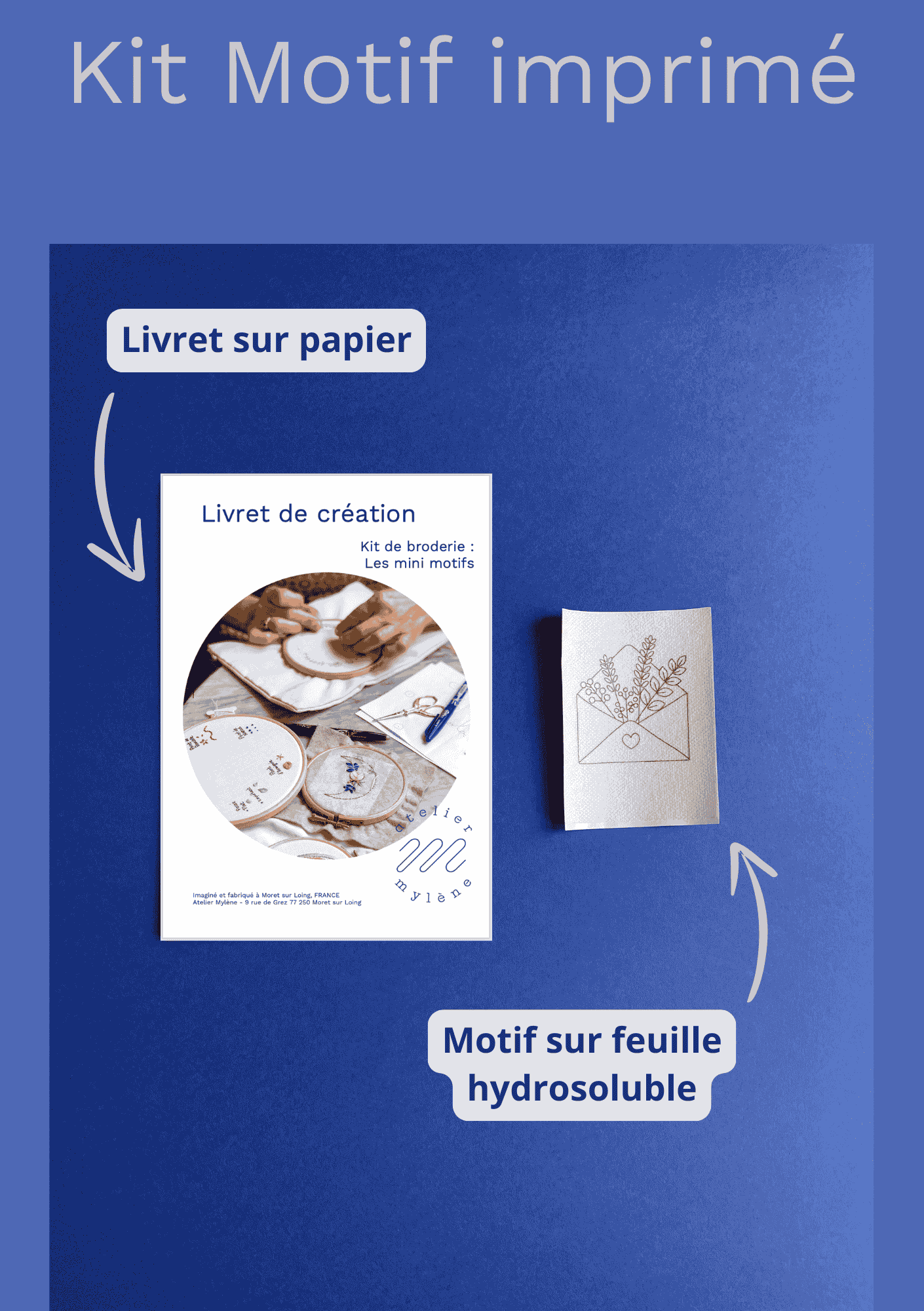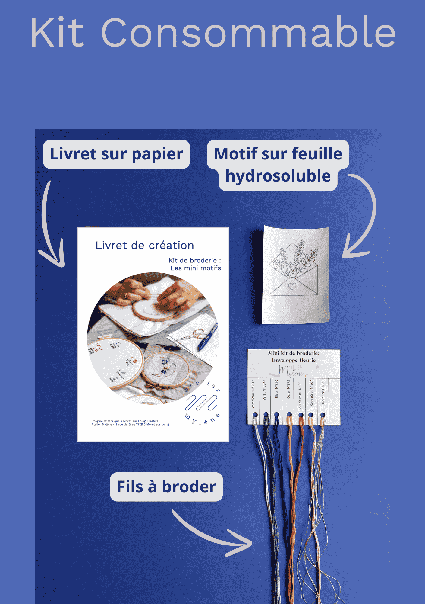 - Le Kit Consommable : Recevez chez vous tout le matériel consommable: les fils à broder + le motif imprimé sur feuille hydrosoluble + le livret de création qui vous accompagne étape par étape .